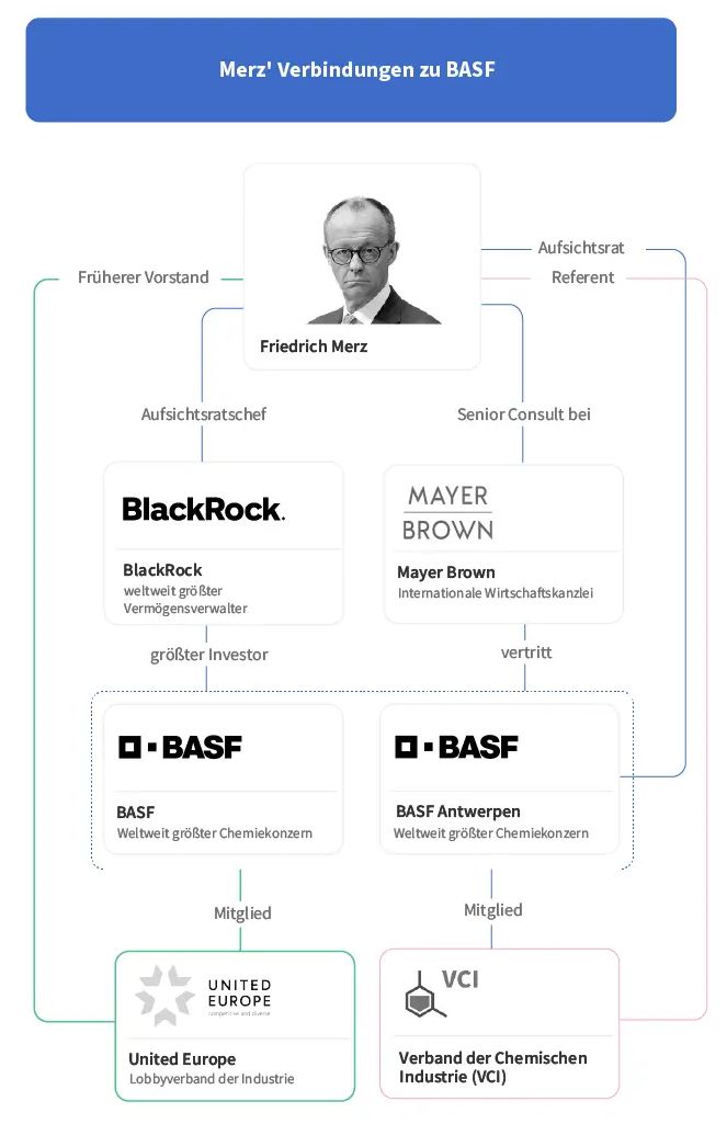 Nach dem Jurastudium und einer kurzen Zeit als Richter startete er seine Karriere als Referent beim Verband der chemischen Industrie (VCI) – in dessen Präsidium BASF stets vertreten ist. Mayer Brown vertritt als Kanzlei BASF, den umsatzstärksten Chemiekonzern der Welt. Blackrock, dessen Aufsichtsratsvorsitzender Merz war, ist der größte Investor bei dem Chemieriesen. Und fast ein Jahrzehnt war Merz Verwaltungsrat bei BASF Antwerpen.